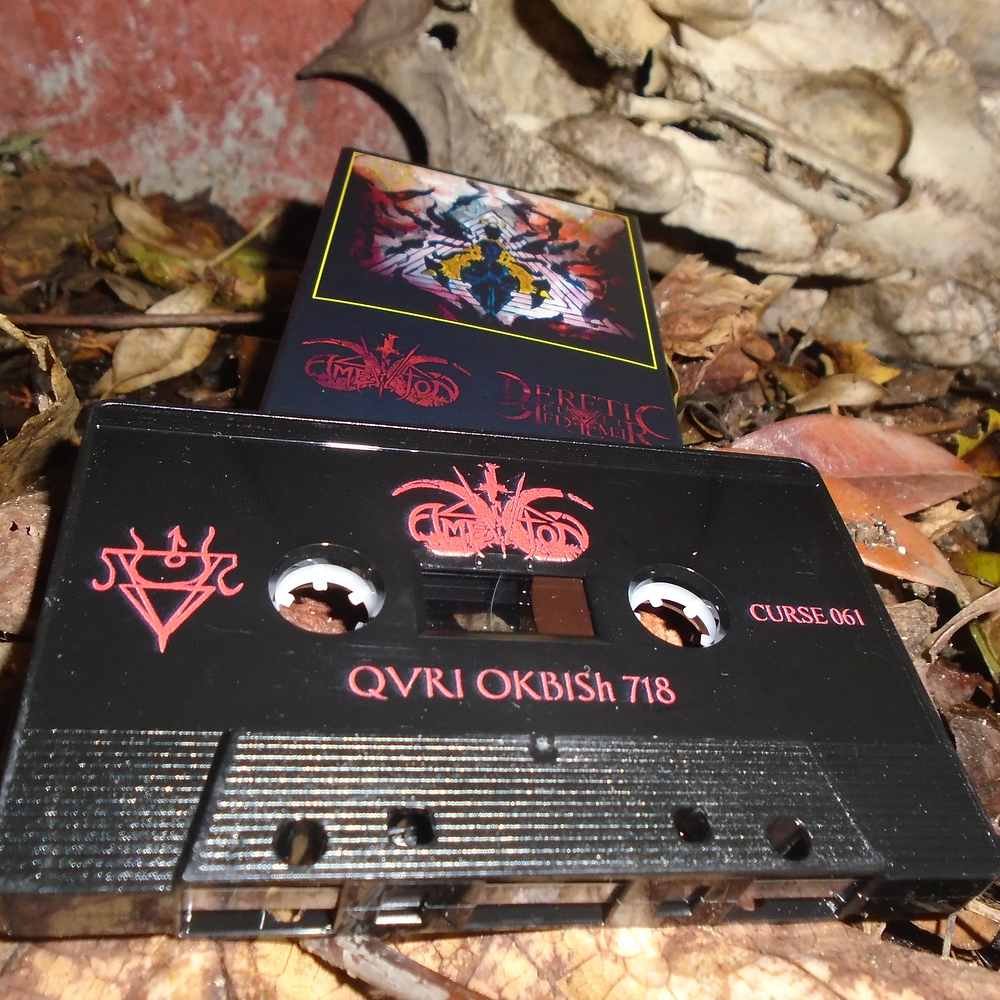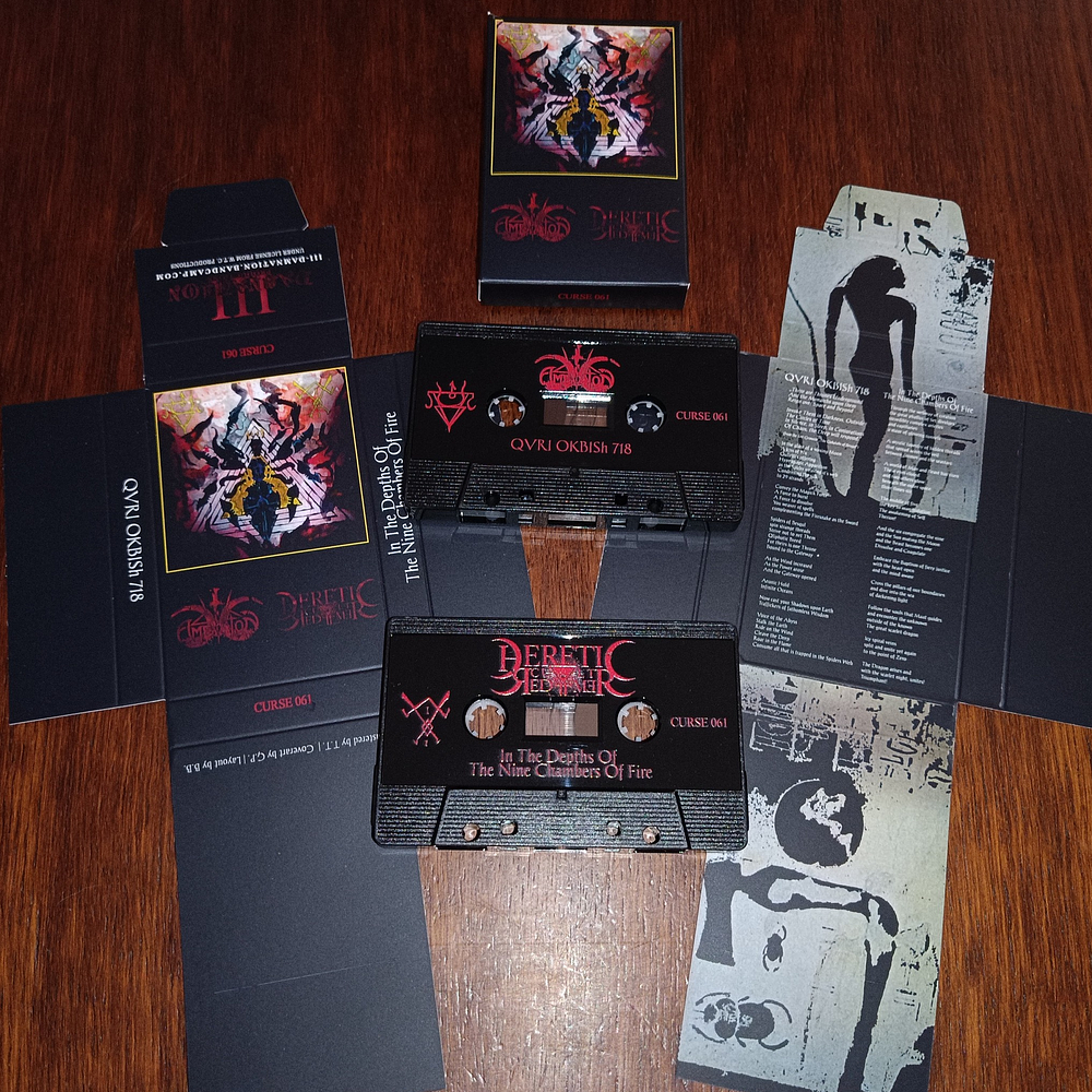A new collaboration has been formed! Amestigon and Heretic Cult Redeemer present a split release under the banner of World Terror Committee in cassette deluxe cardboard edition. A sacred journey to Mauve Zone through the tunnels of Set and the Ninth Arch to the Den of Spider OKBISh! Listen in Darkness! The Deep will respond!