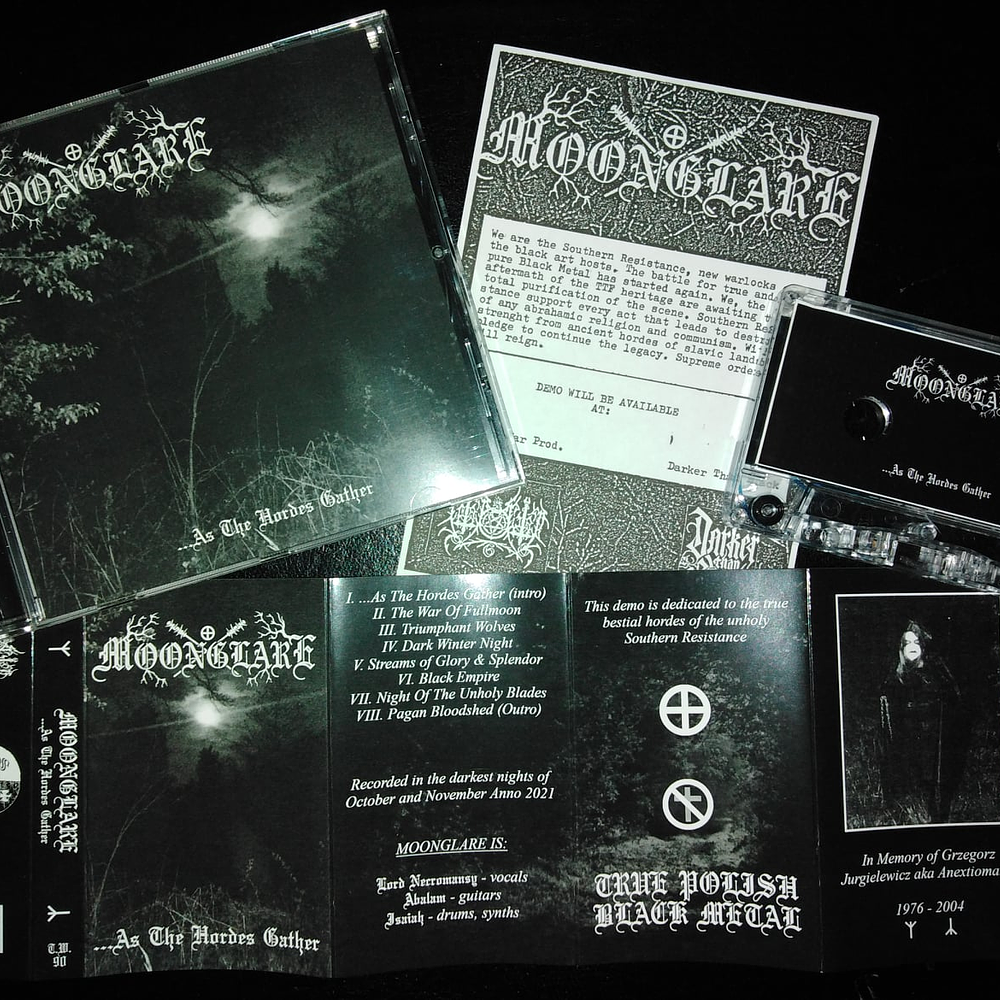 Another cult of the former Polish black metal scene of the 90s - Moonglare. I like this type of stuff, my sentiment is huge and I couldn't pass by indifferently to this release. In addition to the tape, I also picked up a CD almost immediately. What we can find in these raw, slightly muffled sounds straight from old demos (but those of slightly better quality) is nothing else but dark arts close to the old Graveland, Fullmoon, Infernum, Veles. "As the Hordes Gather" is, above all, the enormity of the atmosphere, the old sound and aesthetics, the material opens and closes with an instrumental intro and outro - all according to old traditions. The material of course appealed to me instantly, but in the end it did not impress me as much as for example Diabolical Fullmoon did, or what Blood Stronghold (but this guys are are on the scene for very long time already) still does. Nevertheless, I still qualify it to the current top of this new-old Polish black metal in it's best original form. Debut demo from this promising new Polish black metal band. Paying homage to the 90s pagan black metal scene known as "The Temple of Fullmoon". For fans of Infernum, Graveland, Veles, etc