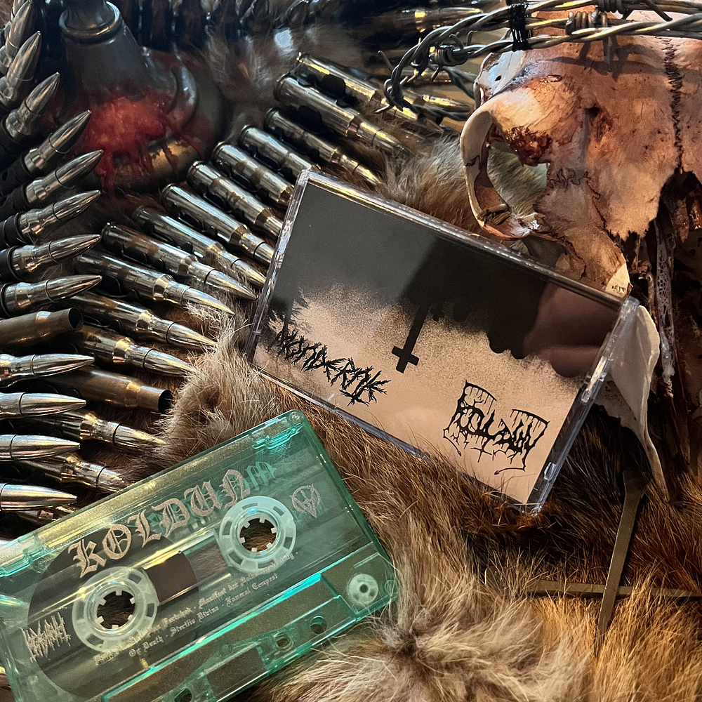 Koldun and Mondernte join forces to create a deep gaze into the abyss. The first side of the tape introduces you to Koldun, whose blistering guitar riffs and relentless blast beats conjure a sonic tempest of despair. Their unapologetic ferocity captures the primal core of black metal, evoking a sense of impending doom and chaos that will engulf you.On the flip side, Mondernte delivers a more atmospheric and introspective take on the genre. Their melancholic melodies and tortured vocals weave a tapestry of desolation, drawing you into a profound trance of bleak introspection. Professionally manufactured tapes. Released through Hexenkult.