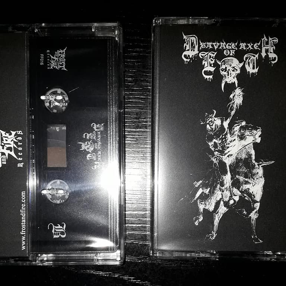 Professionally duplicated tape. Black cassette shell with white imprint on both sides. Professionally printed, double-sided, semi-glossy, 4-panel foldout J-card. 6 tracks of nothing but barbaric Black Metal.