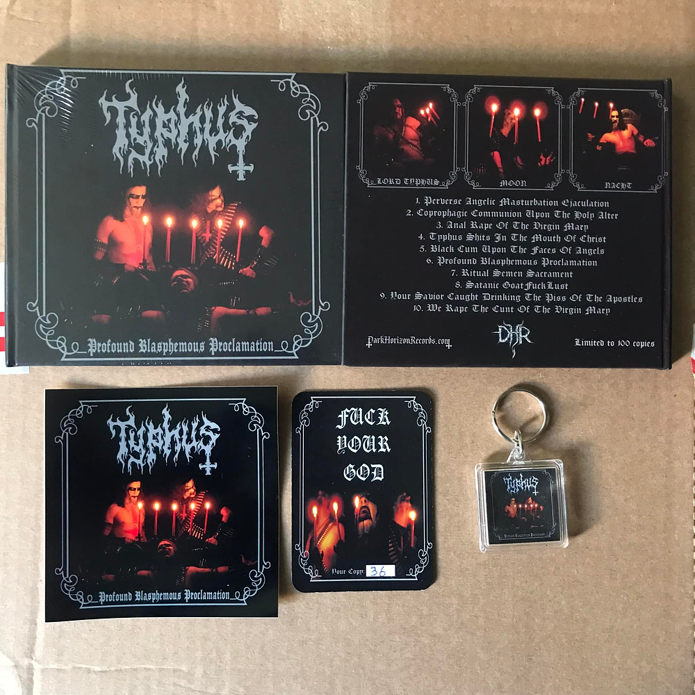 15 YEAR ANNIVERSARY EDITION DELUXE DIGIBOOK CD WITH EXTRAS!TYPHUS are the most notorious band ever released on Dark Horizon Records! For those who immerse themselves in the tradition of "True" Black Metal! A cold, grim, perverse and blasphemous attack on the sheep followers of christ! A spiked fist into the face of god! Typhus are the nails used to crucify their messiah the second time around.Some bands use philosophy, theology and an eloquent approach to Black Metal... TYPHUS use a spiked fist to the face!